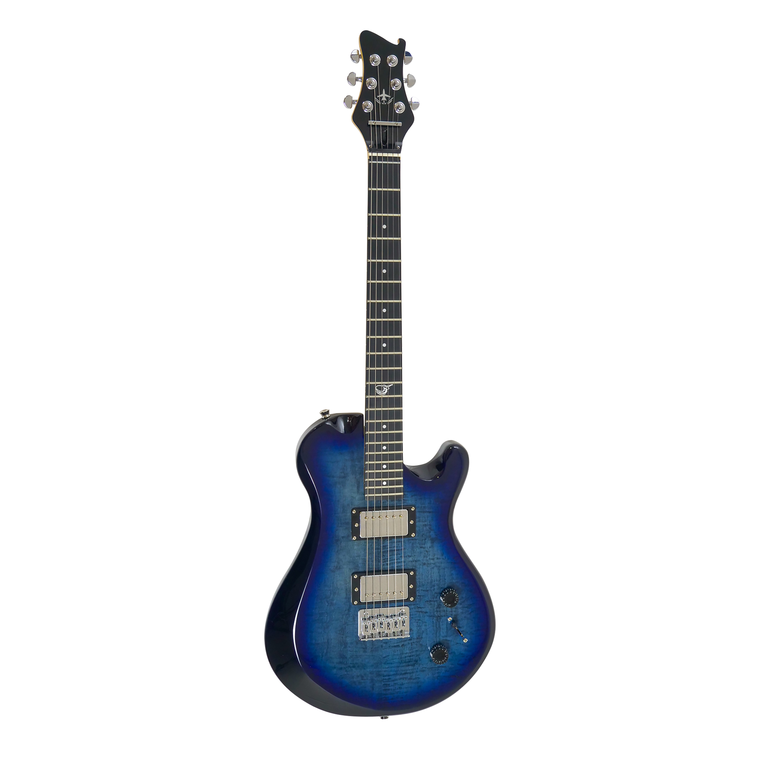 With our patented removable neck and headstock, the OE990BL Faded Blue Electric Overhead travel guitar assembles in less than a minute and packs away into a killer carry-on sized backpack with room for all your gear! Imagine taking full-sized electric guitar on a plane with ALL your gear – in a single carry-on-sized backpack that even converts to carry the fully-assembled guitar! Ergonomically designed with a balanced weight ratio and bevels in all the right places, not to mention a striking charcoal black flamed-maple finish, the OE990BL looks, feels, and plays like a full-sized guitar. That’s right, it has a standard 1 11/16 nut, 25-inch scale length, and even full-sized headstock with locking tuners! If you’re looking for an electric guitar that feels and plays like a quality electric should, looks sexy on stage, and travels like a dream – look no further.