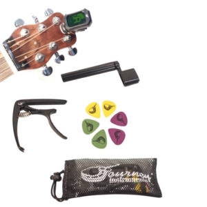 $15.99This travel guitar kit makes a great add-on to any travel guitar for the gigging musicians. Includes: Multi Function Head Stock Tuner, 6-Pick Assortment (2 med-light, 2 med, 2 heavy), String Winder, and One-handed Alloy Capo – with a drawstring mesh bag.