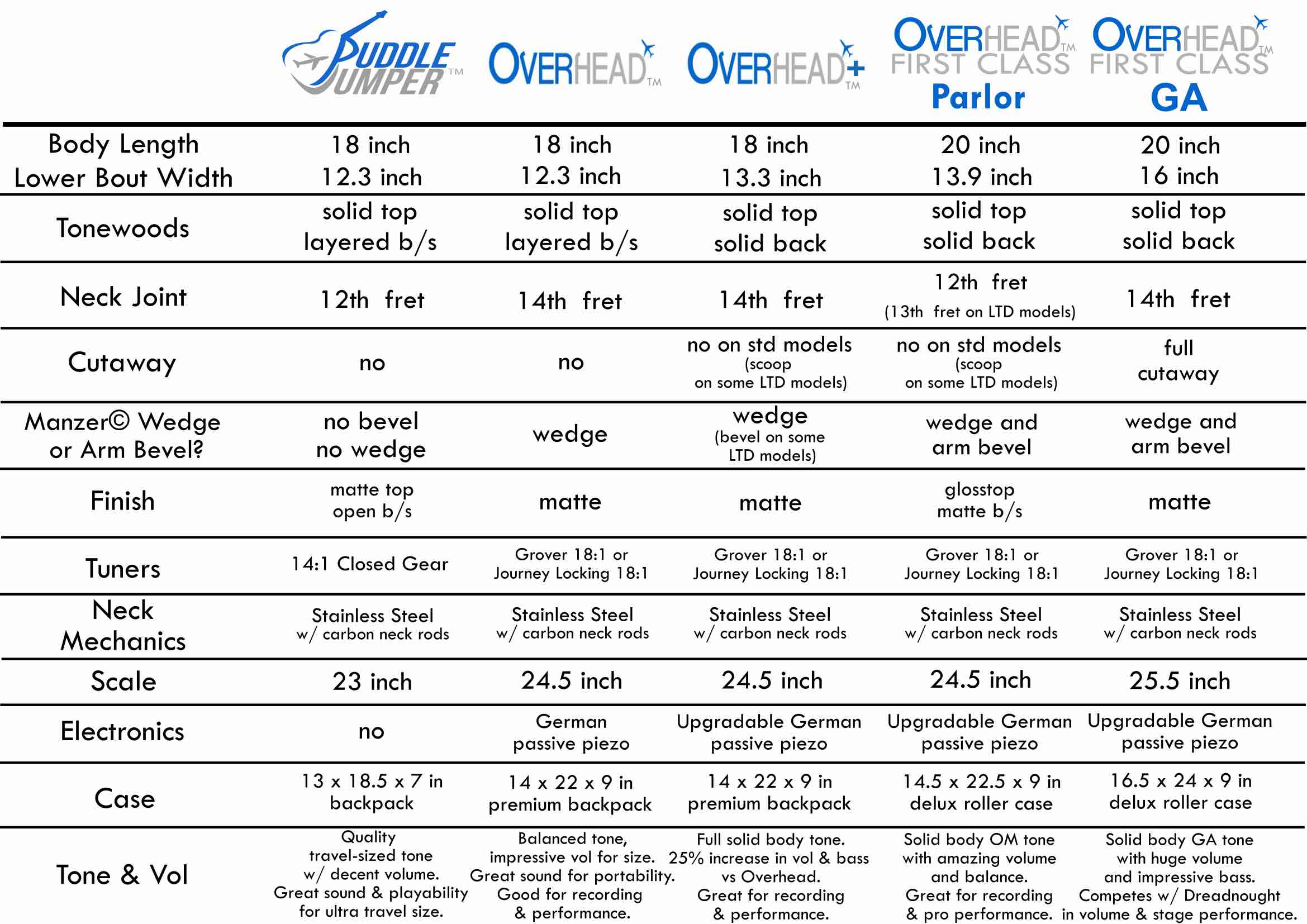 Journey collapsible guitars all come with awesome travel cases and feature our patented stainless steel detachable neck mechanism with carbon fiber reinforcement. This means these guitars aren’t just a joy to travel with, but they also a blast to play and have amazing tone, sustain, and volume for their size. The chart below is an excellent tool to help you choose which guitar is the best for your needs.