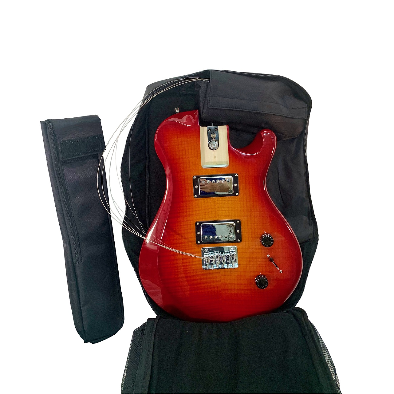 - Custom full-featured travel backpack fits the entire collapsed guitar with ample room for all your gear – cables, pedals, laptop, clothes and more! It even converts to carry the fully-assembled guitar.