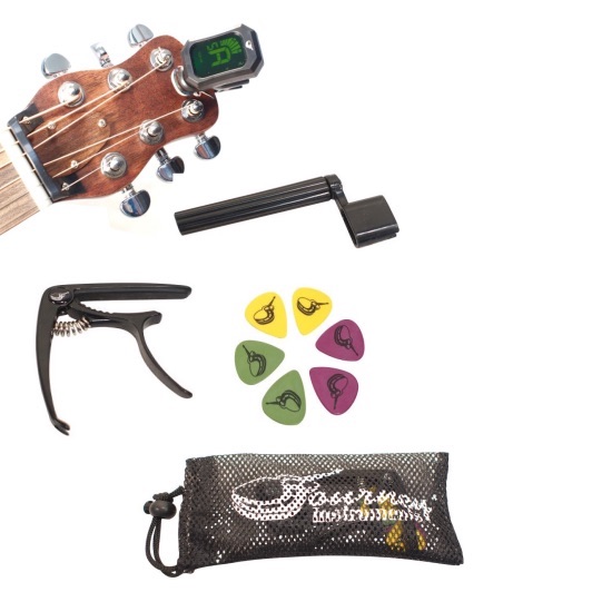 This travel guitar kit makes a great add-on to any travel guitar for the gigging musicians. Includes: Multi Function Head Stock Tuner, 6-Pick Assortment (2 med-light, 2 med, 2 heavy), String Winder, and One-handed Alloy Capo – with a drawstring mesh bag.