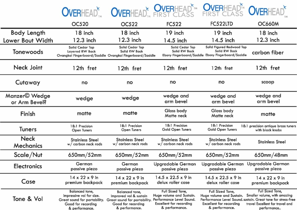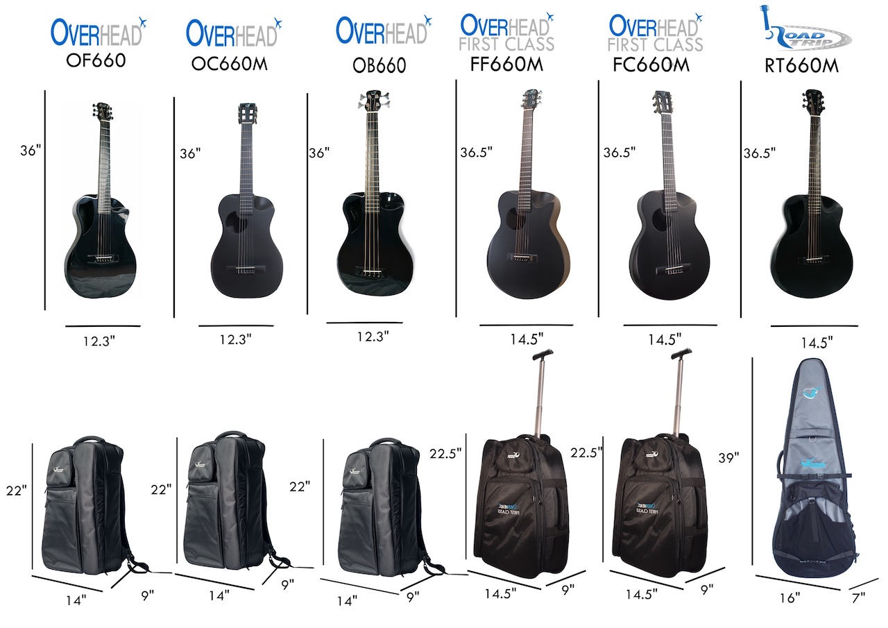 - The FF660M and FC660M are the new First Class Carbon Models. These have a larger 14.3-inch-wide soundboard compared to the 12-inch soundboard of the OF660. The tonal balance of the FF660M is like the OF660, but the volume is larger. Both come with volume wheels on the passive pickup system shared with all our guitars. They also have roller backpacks for easier transport around airports if you have another handbag or backpack.
