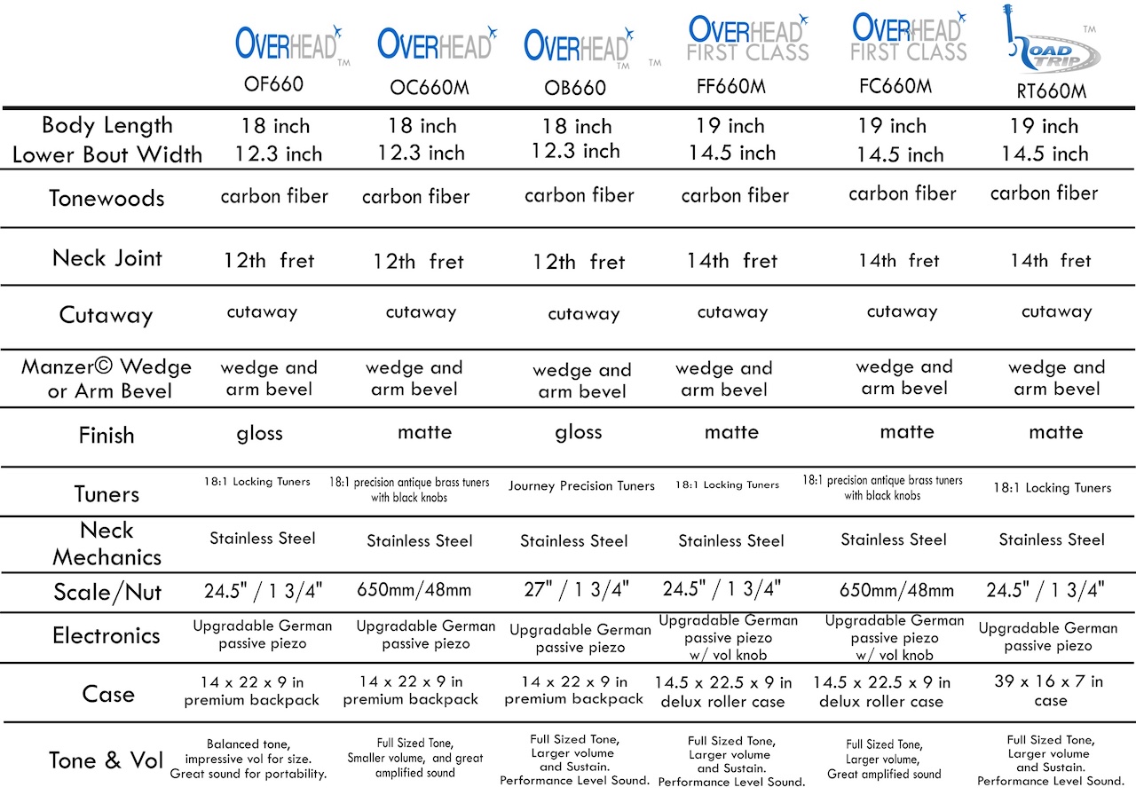 Journey collapsible guitars all come with awesome travel cases and feature our patented stainless steel detachable neck mechanism with carbon fiber reinforcement. This means these guitars aren’t just a joy to travel with, but they also a blast to play and have amazing tone, sustain, and volume for their size. The chart below is an excellent tool to help you choose which guitar is the best for your needs.