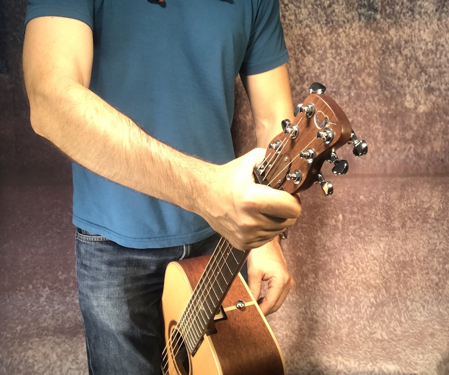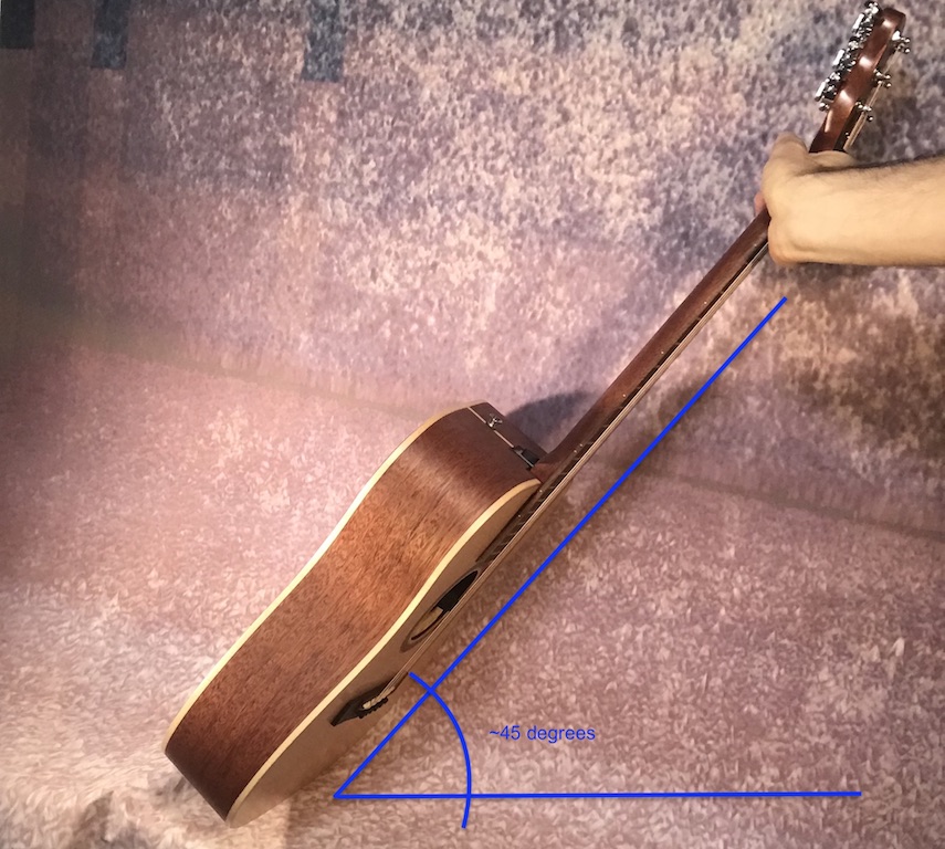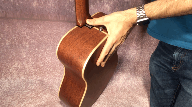 1. Insert the neck into the slot with the guitar at an angle and the soundboard facing downward at about a 45 degree angle. The fretboard rests against the palm of one hand while the other hand is on the back of the guitar holding the knob.
