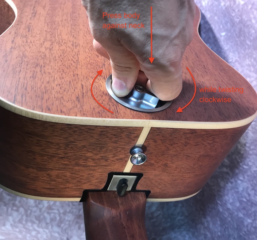 3. With the guitar firmly between your legs, twist the knob clockwise with one hand while pressing the neck against the neck slot until the gap between the neck and body is minimized.