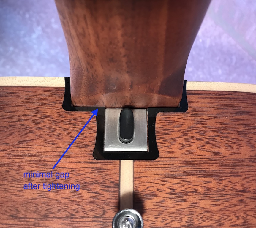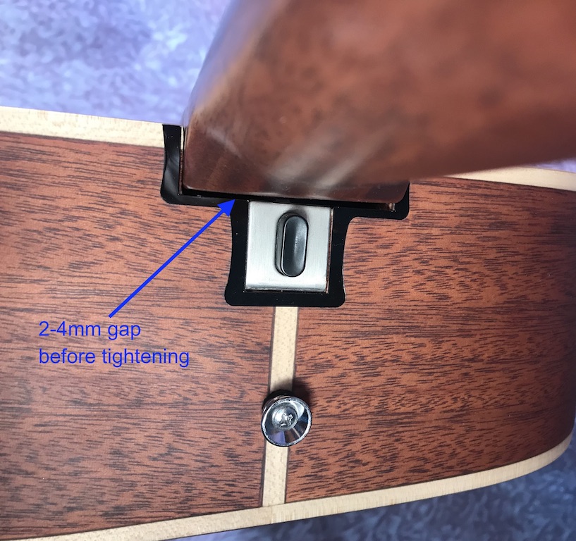b. You can use the turn knob on the back to adjust neck angle – this will increase or decrease the gap between the neck and the slot in the body. The bigger the gap, the higher your string height will be at the 12th fret. You can set the action lower for easier playability if you have a lighter playing style – then you can adjust the knob on the back to increase string height for heavier playing and strumming.
