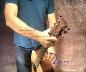 a. Placing the body of the guitar between your knees, Twist the knob with one hand while pressing the headstock downward against the guitar body – this makes it easier to twist fully. see pic: