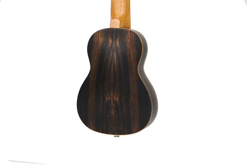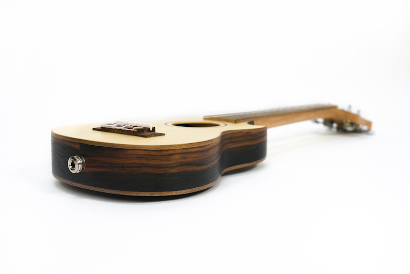The J-ukeTM is made with a premium grade solid sitka top and engineered Ebony back and sides with sitka bracing. We use premium open-back tuners to keep the weight down. Ebony is a phenomenal tonewood with a clear and resonant tone and a shimmer that is truly eye-catching. The Walnut scoopaway gives great access to upper frets and just looks friggin’ cool. Walnut binding and rosette with matching bridge and fingerboard make for a distinctive and elegant ukulele look.